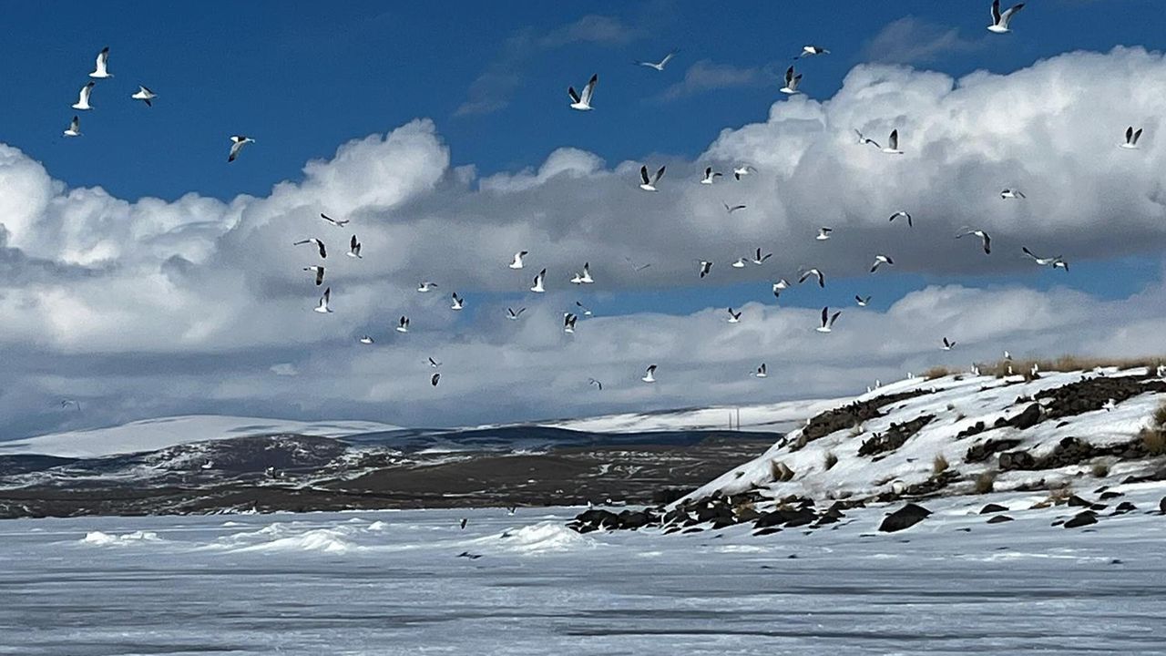 Kars’ın Arpaçay ile Ardahan’ın Çıldır ilçesi arasındaki Çıldır Gölü’ne, martılar, bu sezon yaklaşık olarak 15 gün erken geldi. Her yıl havaların soğumaya başlamasıyla kasım ve aralık aylarında gölden ayrılan martılar, mart ayının ilk haftası, göl yüzeyinde çözülmenin başlamasıyla geri dönüyor.